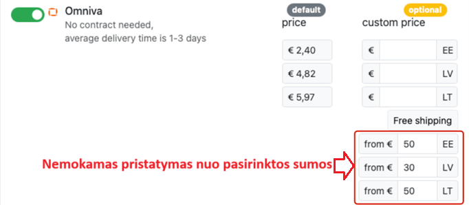 - Galimybė įjungti nemokamą pristatymą nuo tam tikros krepšelio sumos