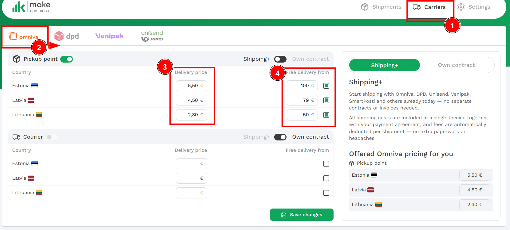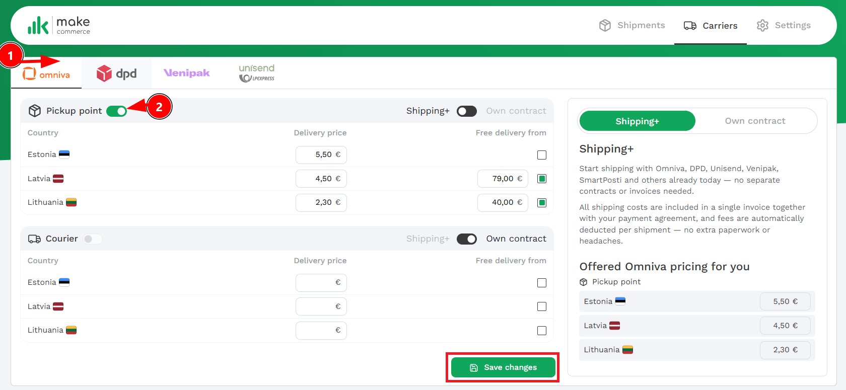 - Atidarykite „MakeCommerce“ modulį savo parduotuvės platformoje – pasirinkite Carriers -> Omniva/DPD/Venipak/Unisend -> Own contract (sava sutartis) -> įveskite API raktus -> Connect (Prijungti)