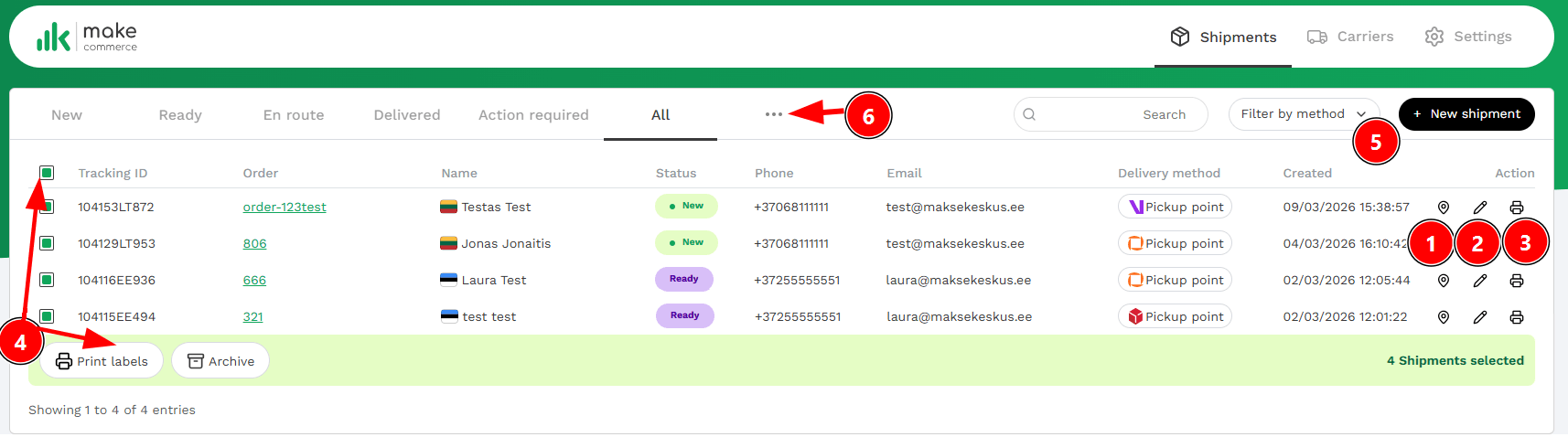 - Filtruoti siuntas pagal statusą: New – Nauja; Ready – Paruošta; En route – Pakeliui; Delivered – Pristatyta; Action required – Reikalingas veiksmas; All – Visos siuntos.