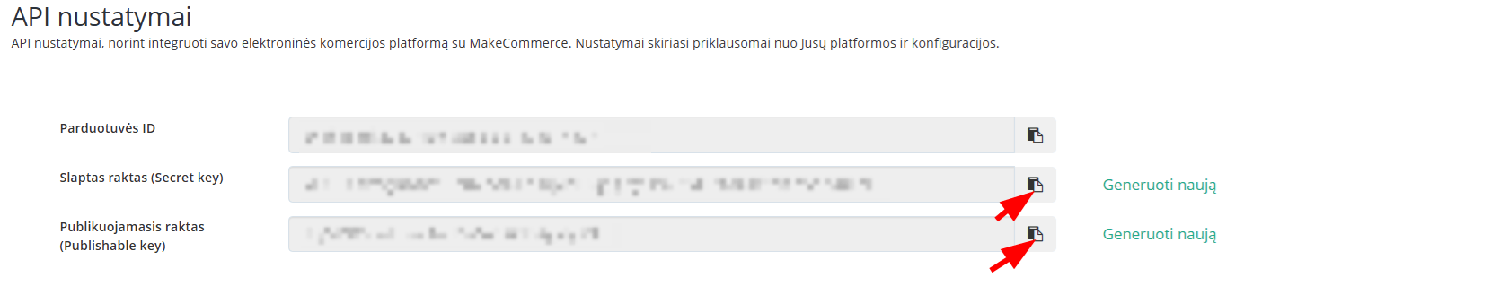 - Šiame puslapyje įvedami API raktai, kurie sujungia parduotuvės modulį su mokėjimų sistema. Bandomieji raktai įrašomi automatiškai. Reikia įvesti LIVE aplinkos raktus.